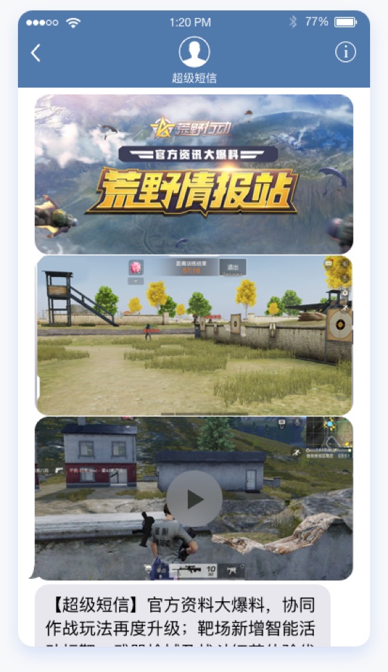 使用超级短信,来爆料官方资料或版本前瞻,以《荒野行动》为例:通过gif动图/视频等多种内容下发,介绍武器枪械及战斗细节体验优化;协同作战:新增天赋守护等内容